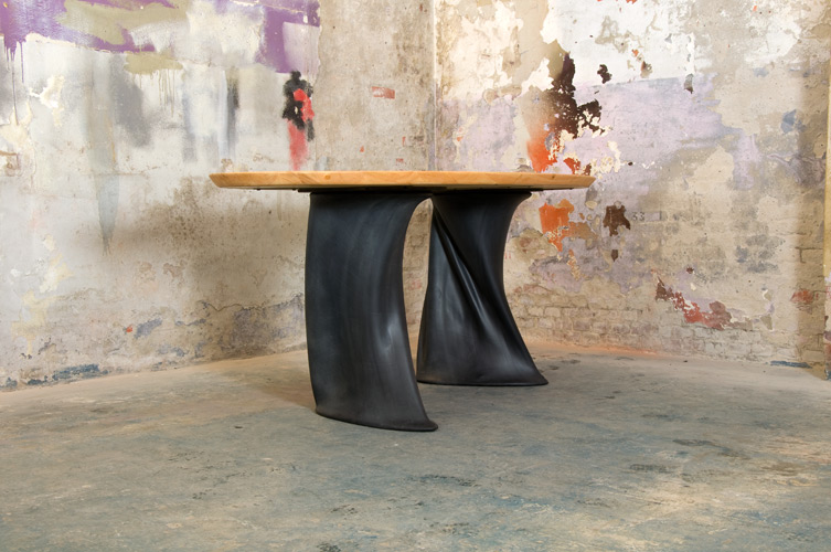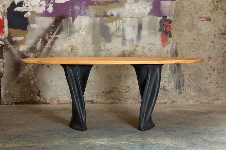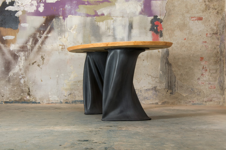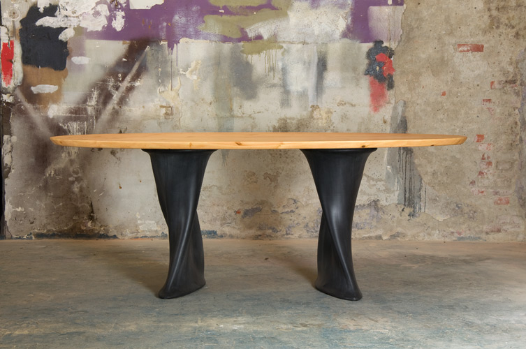 Table Chapli has an oval wooden leaf. The table has two rubber legs with a frame of steel. By using the properties of rubber on an inventive way, the legs got a playful and organic form. The table legs are placed in an unusual angle to each other which gives the table from each different point of view an almost completely different appearance. Rubber stool ‘Tuby‘ (model 50 cm) is suitable for this table.